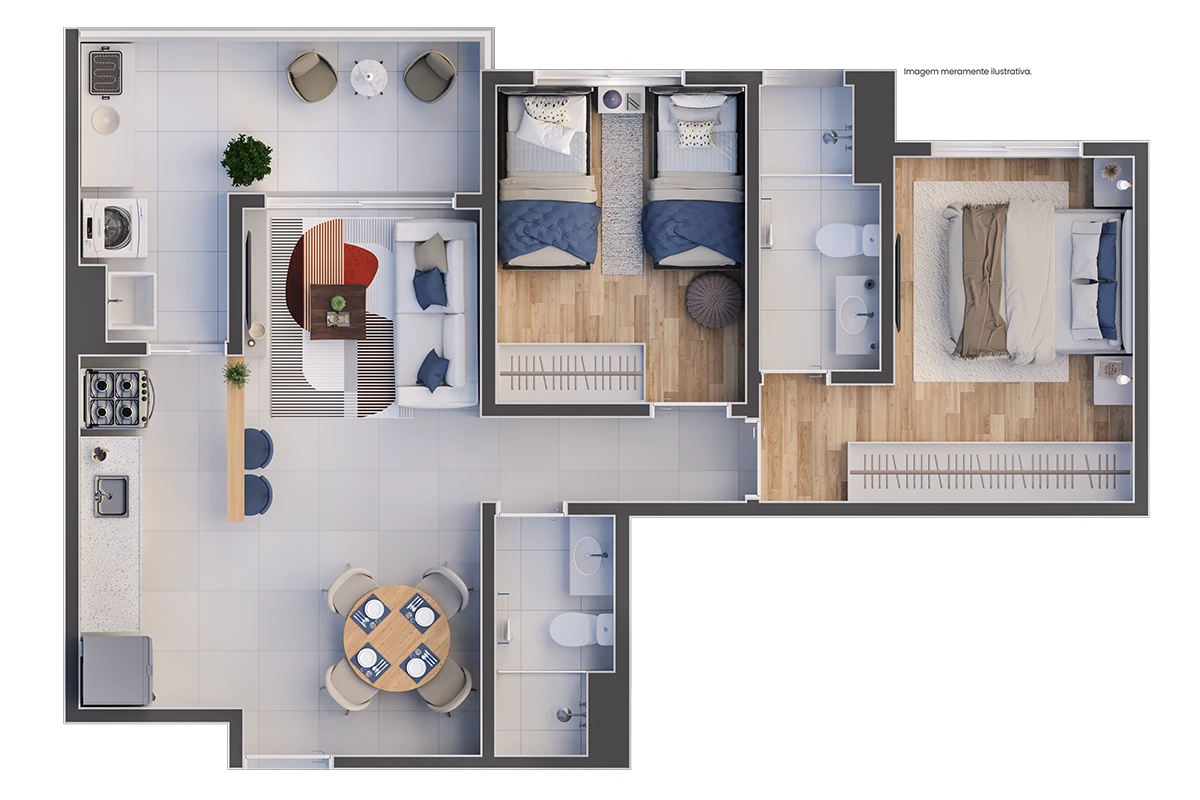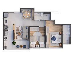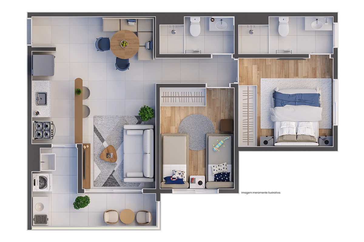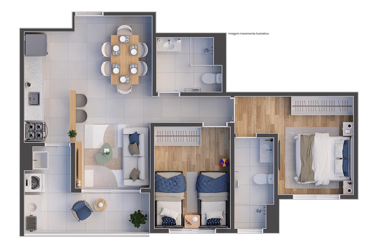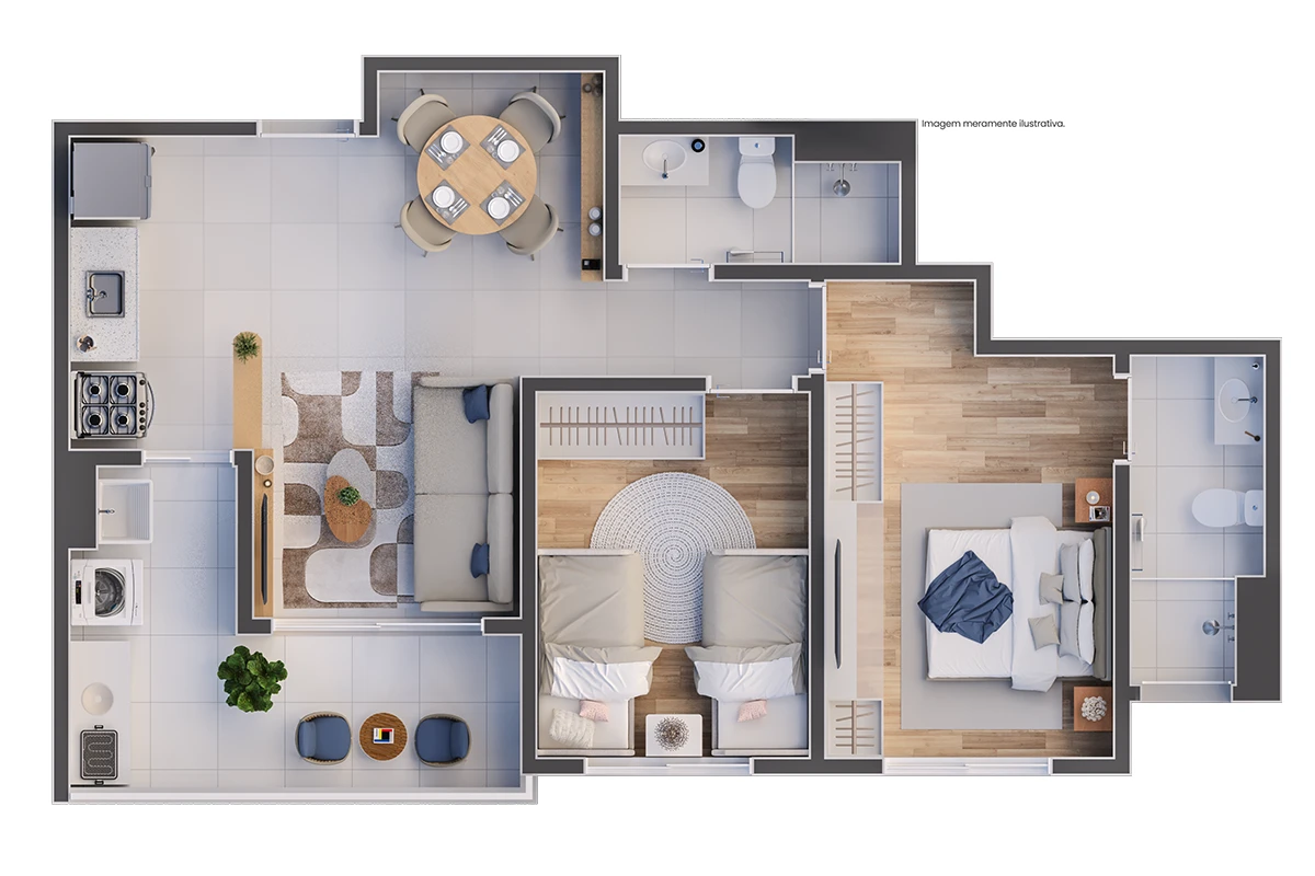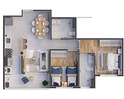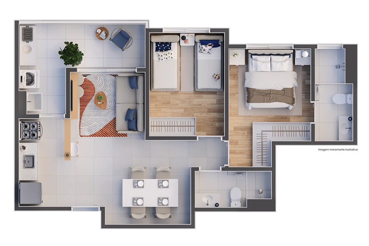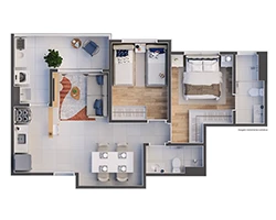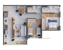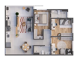* Perspectiva artística da planta com sugestão de decoração. Os móveis e objetos são de dimensões comerciais e não fazem parte do memorial descritivo.