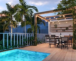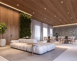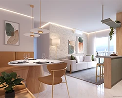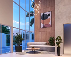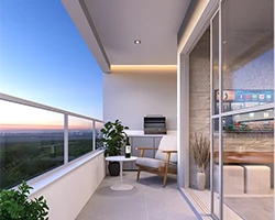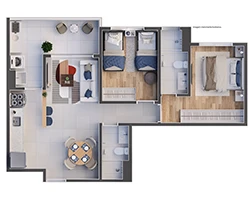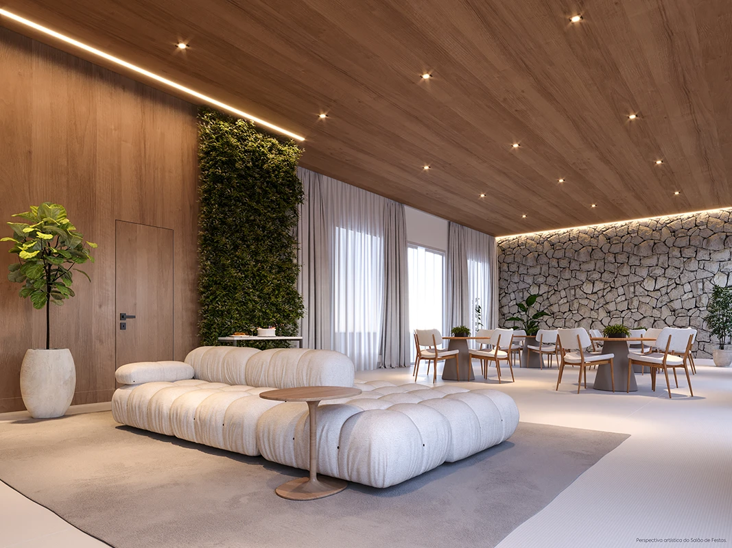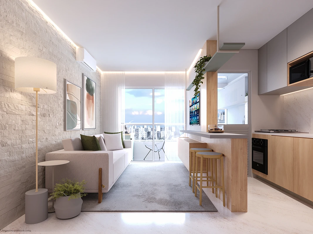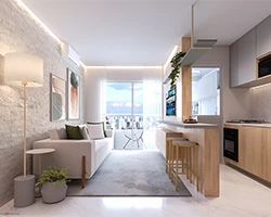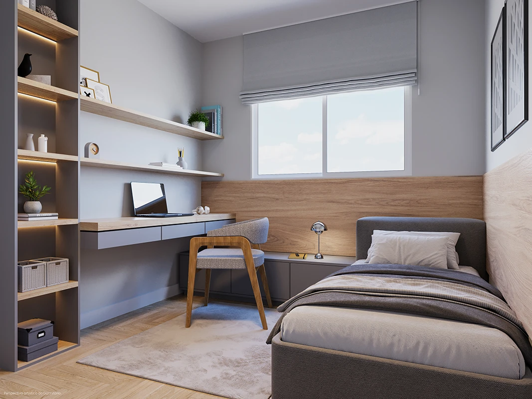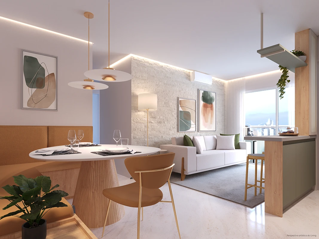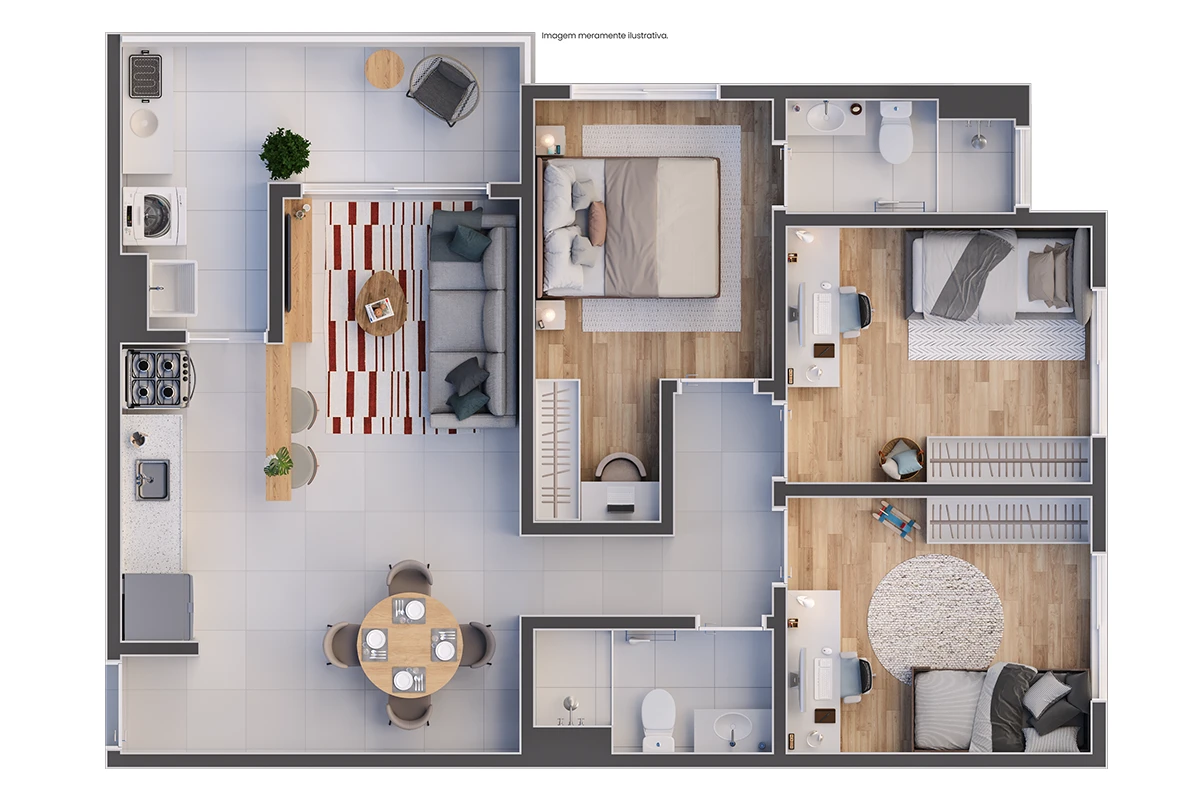 * Perspectiva artística da planta com sugestão de decoração. Os móveis e objetos são de dimensões comerciais e não fazem parte do memorial descritivo.